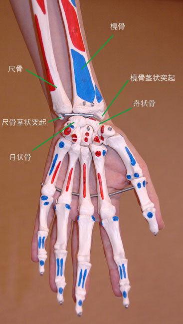 尺骨(しゃっこつ)及び橈骨(とうこつ)の茎状突起(けいじょうとっき:手首両側のくびれている部分。写真参照)の位置関係を、自らの手首と触れ合って調べてみるといい。親指側の橈骨茎状突起と、小指側の尺骨茎状突起の位置を結ぶと、前腕を斜めにカットしたような角度になっていることがわかるだろう(腕の内側から見るとわかりやすい)。それが「手首の(おおよその)角度」だ。