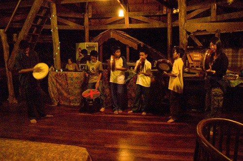 ◎私たちがスカウのリゾート・ホテルに到着した日、ホテル・オーナーやスタッフらによる音楽と歌と踊り(マレーシアの伝統武術・シラットの表演)の歓迎式が、夕食後、レストランを片づけた即席の舞台にて、にぎにぎしく執り行なわれた。